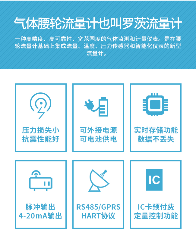 氣體腰輪流量計也叫羅茨流量計是一種高精度、高可靠性、寬范圍度的氣體監測和計量儀表。是在腰輪流量計基礎上集成流量、溫度、壓力傳感器和智能化儀表的新型流量計。
