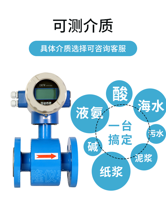 可測量介質:水、污水、鹽水、海水、空調水、消防水、循環水、硫酸、鹽酸、硝酸、醋酸、堿溶液、泥漿、紙漿、煤漿、果漿、果汁、礦泉水、飲用水、自來水、醬油、果醬、啤酒、果汁、米酒、牛奶等導電液體,特別適用于酸堿類有腐蝕性的液體。